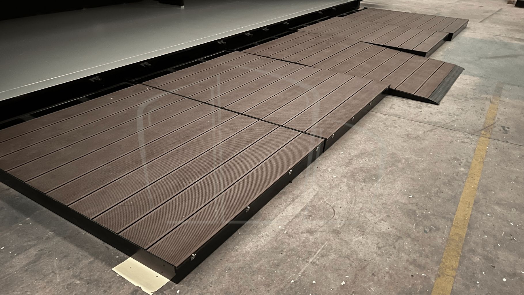 Además, se proporcionaron detalles como cuerdas de control de masas para delimitar la zona de la tarima, con postes desmontables. Soportes para banderolas promocionales. Revestimiento interior de las puertas para colocación de vinilos promocionales. Armario de 2×2,5×0,8 m con puerta corredera. Instalación eléctrica, con raíles de focos en el interior y líneas independientes para la iluminación exterior y las pantallas promocionales