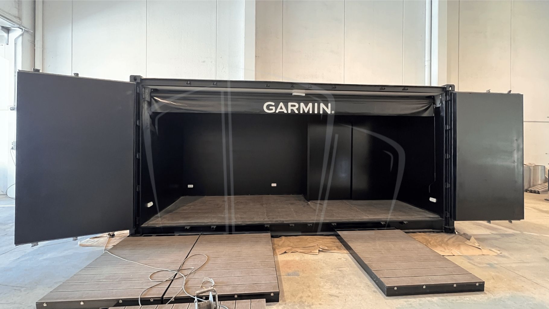 Partiendo de un contenedor 20’ Open Side (6 m. y 4 puertas en un lateral), la mayor parte del trabajo se centró en el interior: Paredes forradas con OSB, aportando textura al acabado. Pintura epoxy en el suelo para hacerlo antideslizante. Un toldo, de casi 6m. de largo, con el anagrama de la marca. Una tarima exterior, con rampa para minusválidos, desmontable para llevarla dentro del contenedor durante el transporte. Pintura y acabados corporativos según el branding de GARMIN.