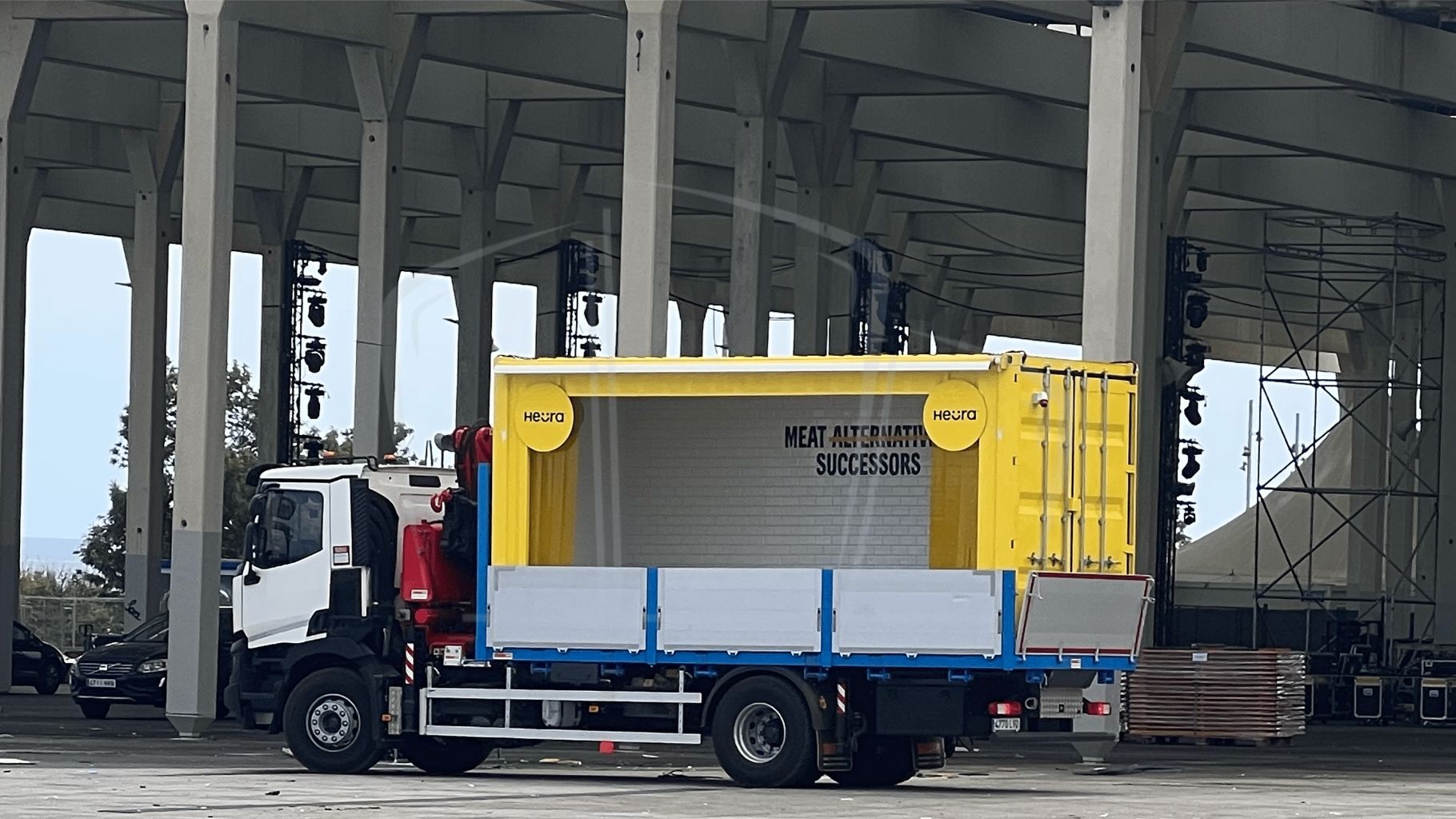 Contenedor de 15 m2 con una gran apertura lateral y toldo con imagen corporativa. En su interior alberga una cocina 100% funcional, con paredes alicatadas, mobiliario en acero inoxidable y cortinas laterales repelentes de insectos.