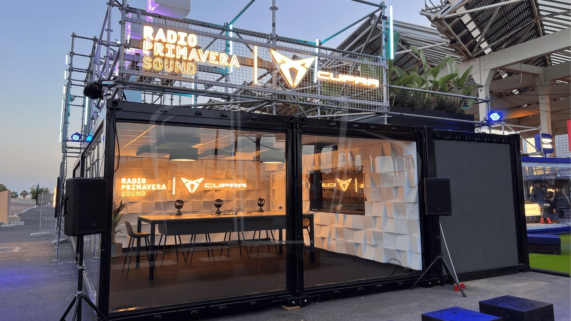 Estudio de radio para el conocido certamen musical PRIMAVERA SOUND. Patrocinado por CUPRA y el propio evento, se fabricó un estudio diáfano de 30 m2 con una sala de técnicos de 15 m2 adicionales.