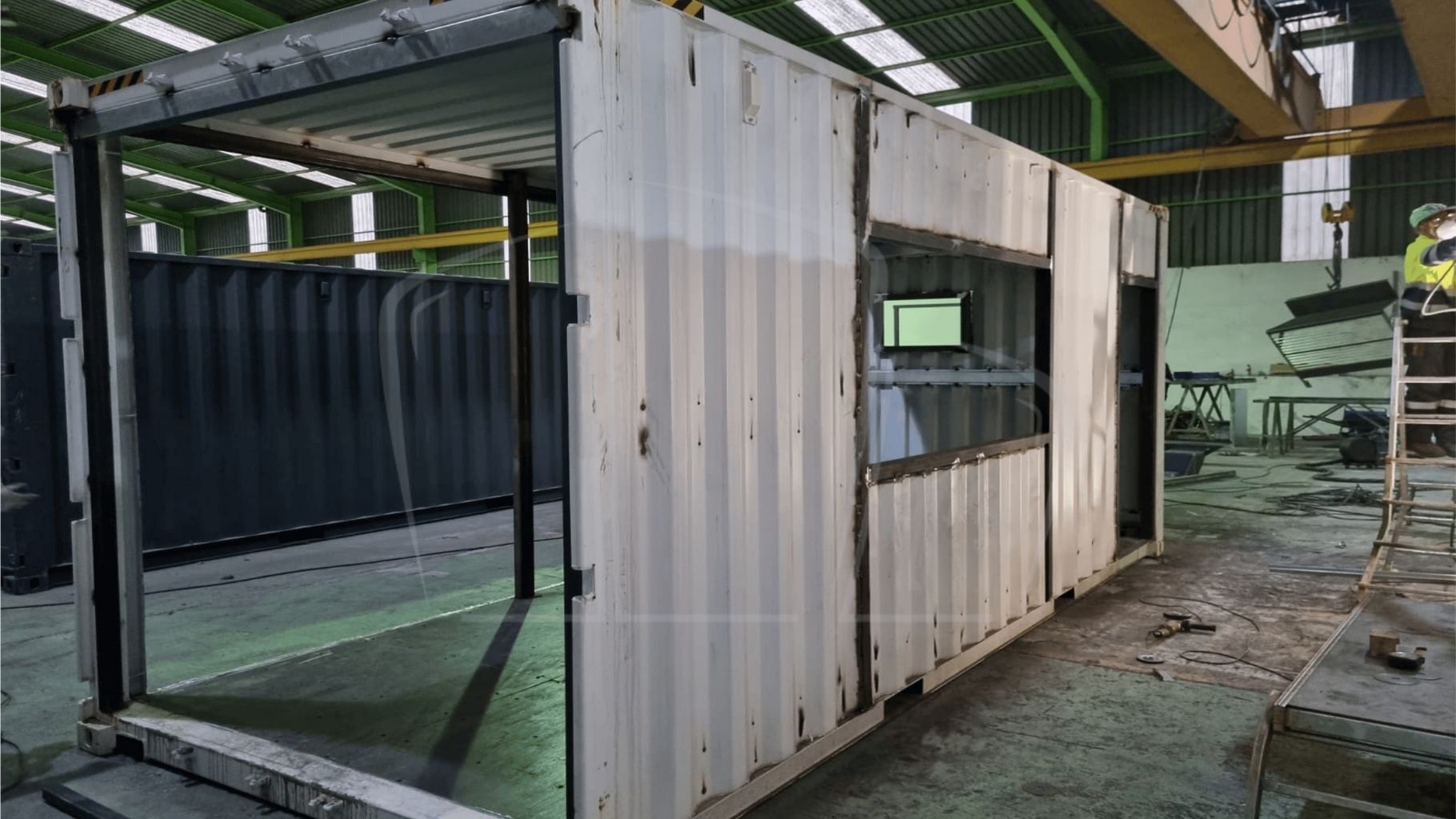 Para conseguir estas superficies se ensamblaron 3 contenedores 20’ High Cube (6×2,44×2,96 m). En el estudio se retiró por completo una pared de cada contenedor para conseguir el espacio diáfano. Además, las paredes exteriores fueron sustituidas por grandes cristaleras con vidrios laminados antivandálicos. En el interior se practicó una gran ventana acristalada para comunicación visual con los técnicos y se insonorizaron paredes y techo. Se completó con moqueta en el suelo que ocultaba una trampilla para el paso del cableado técnico. De este modo se evitaban resaltes o cables a la vista. Toda la instalación fue acompañada de una instalación eléctrica a la altura de los equipos de sonido y la iluminación, preparada para una conexión rápida.